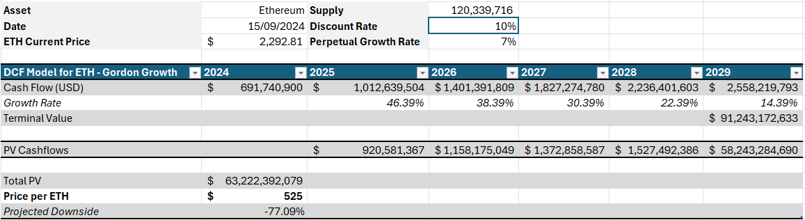 Using Gordon Growth Model (GGM), a DCF that assumes a constant growth rate for cash flows in perpetuity, we must solve for the present value of perpetual growth [17]. Previous models suggest between 3-7%. Our base case uses 7%, but we provide an additional, more optimistic view with 10%. This has a material effect on the value of ETH, providing a range for ETH and highlighting the impact of subjective assumptions.
