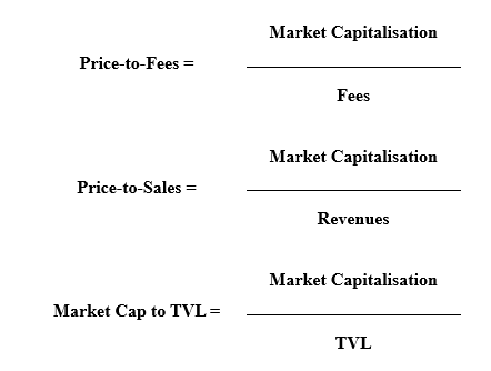 A price-to-fees ratio (P/F) indicates how the market values fees generated by a smart contract platform and can be likened to price-to-book in traditional finance. The same methodology can be applied solely to revenues (P/S). TVL represents the value of funds currently staked on all dApps on a smart contract platform and can also be compared against the total market capitalisation (price) of the blockchain.