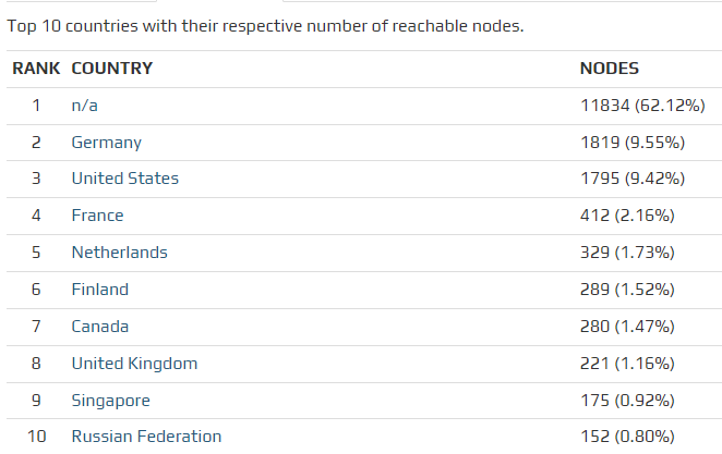 Active nodes (those currently reachable) are distributed globally, with Germany holding the largest single proportion. However, closer viewing reveals that a substantial number are consolidated in a small group. Hetzner Online GmbH hosts 5.49%, Contabo GmbH 2.60%…even Amazon hosts 1.34%. Are nodes susceptible to control by powerful, centralised entities?
