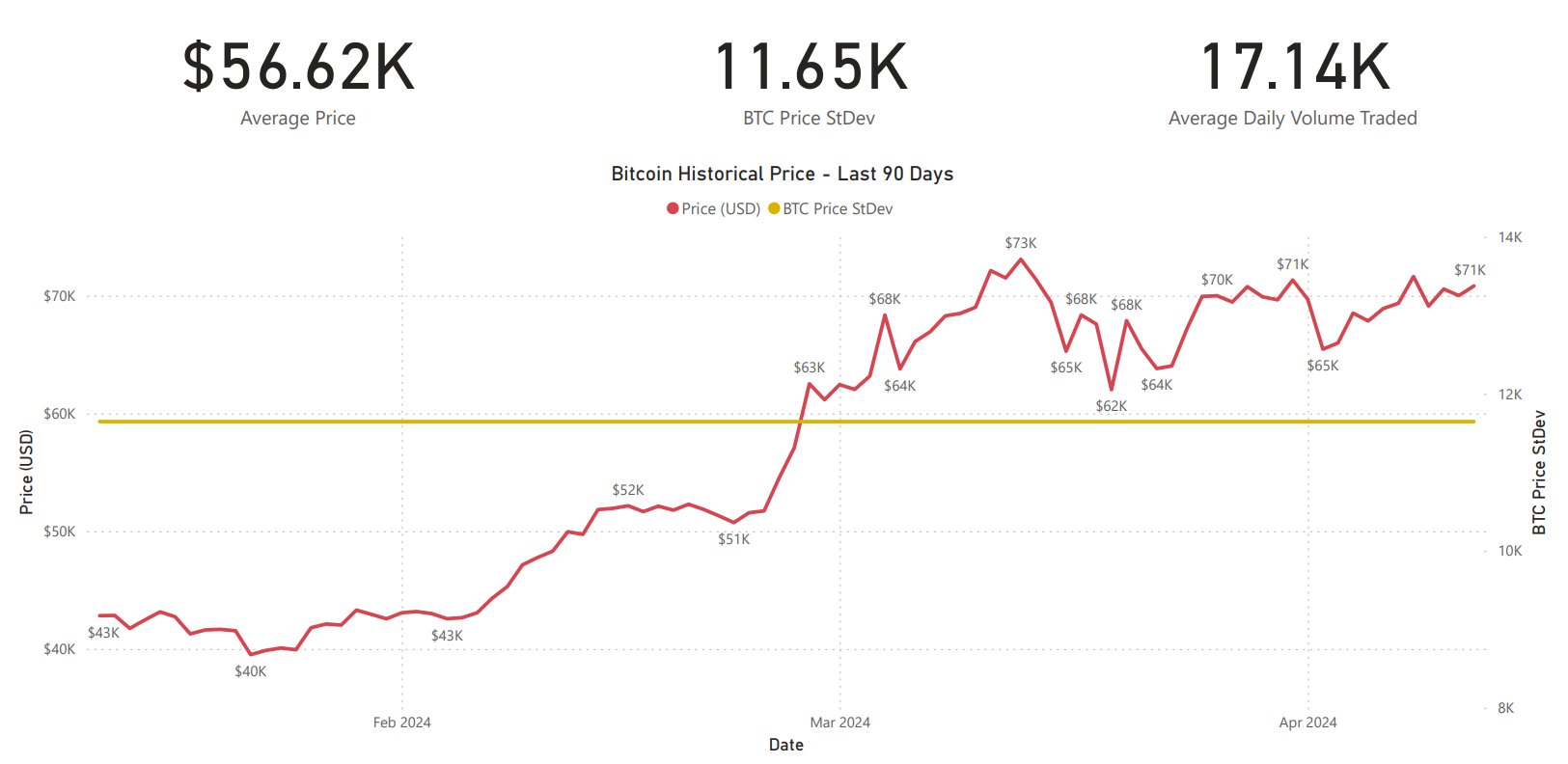 Over the last 90 days, BTC’s price has been relatively volatile, with a standard deviation of 11,650, but is trending upwards, perhaps in anticipation of the halving. Average daily volume traded of 17,140 BTC is very low compared to other cryptoassets, however, is attributable to the average price of one BTC: US$56,620. Average daily value traded (price * volume) is extremely large at US$970,466,800. Though, interestingly, this is 26.64% less than that of Ethereum at time of writing: US$1,322,873,500.