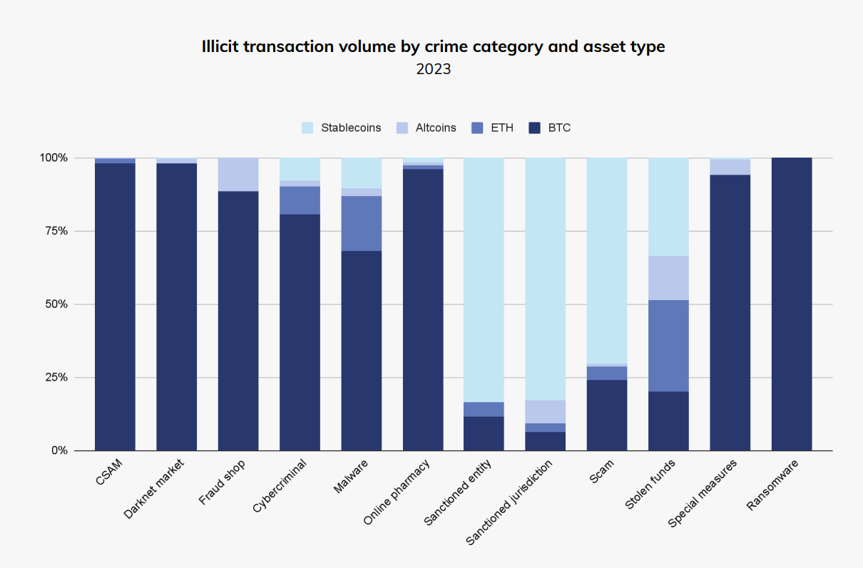 Attacks are not localised to BTC, with venues being drained of Ethereum, Solana and Tether also. In 2021, Bitcoin was the cryptoasset of choice among cybercriminals, but this has shifted and stablecoins now account for significant volumes of illicit transactions.