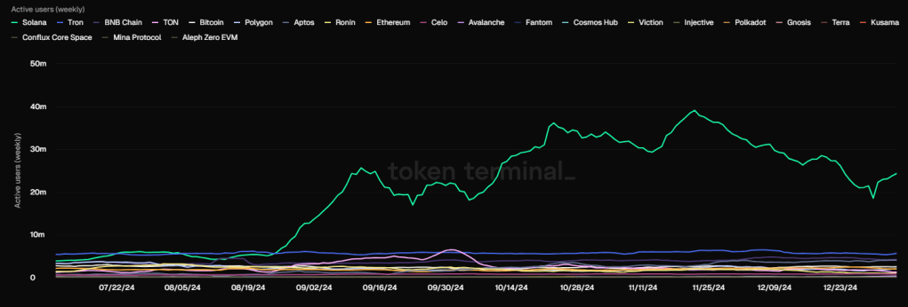 Developer activity appears to be attracting users. Solana’s monthly active address count exceeded 100 million in October, a huge jump from 509,000 recorded at the start of 2024. And, despite a drop across December, the user base remains very high compared with other networks.