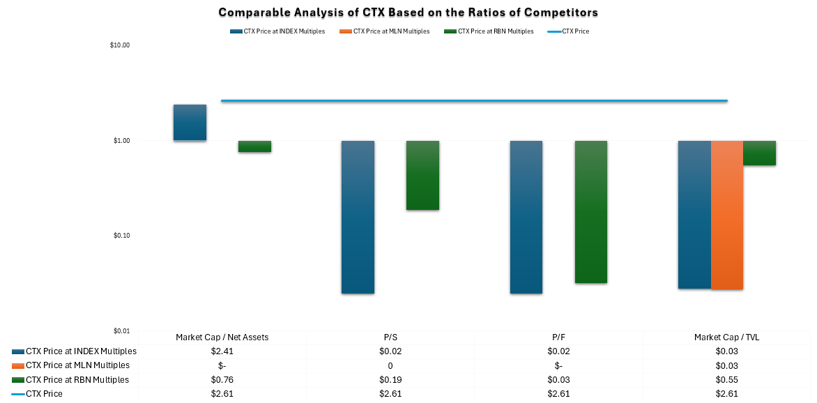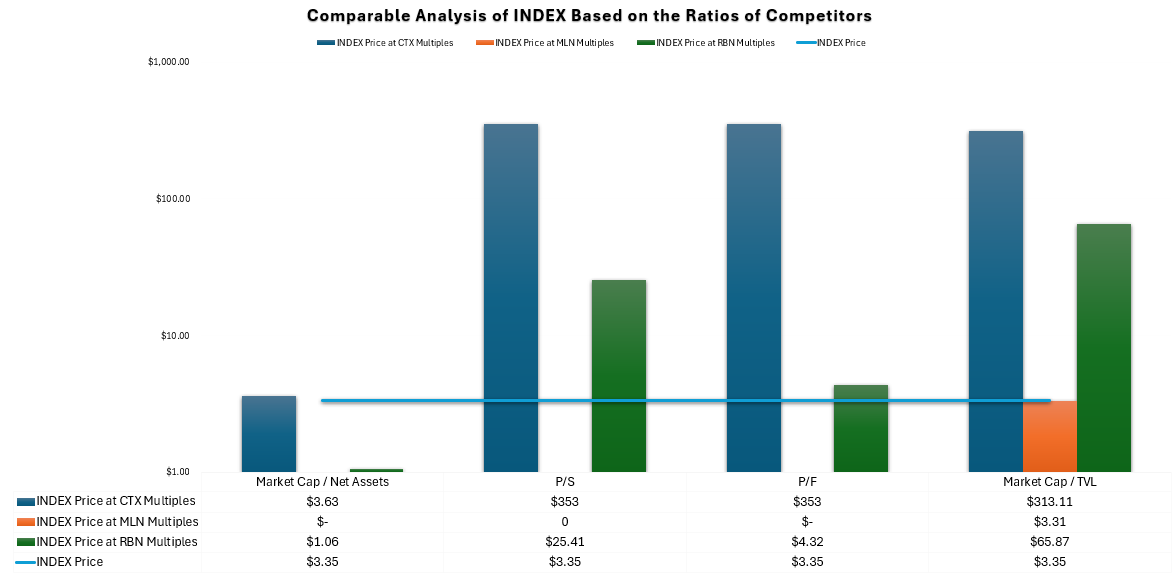 It is immediately clear that INDEX is undervalued with the fundamentals of RBN and CTX. We use a logarithmic y-axis to project a 10,437% price increase to $313-$353 based on CTX. Thoughtful consideration deems this unreasonable, and a more prudent conclusion should be that CTX is overvalued.