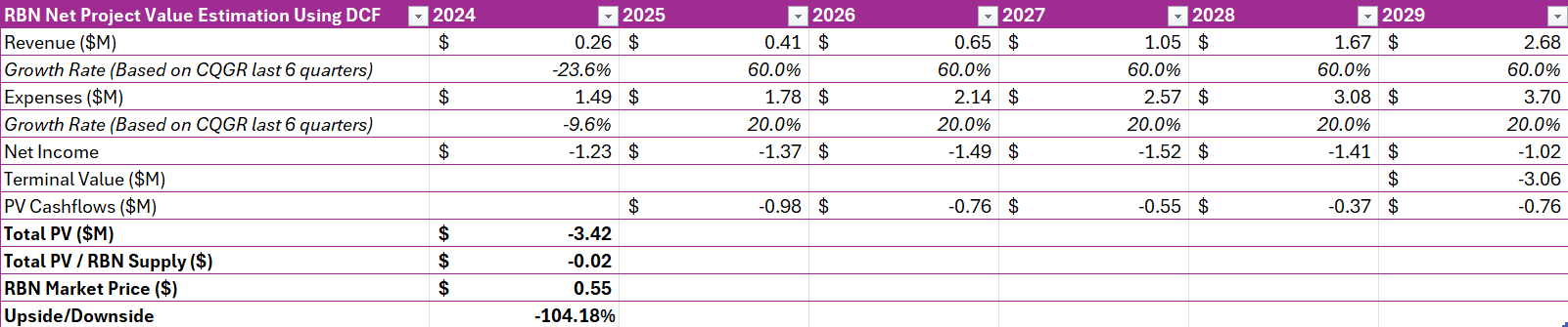 However, all other ratios suggest a range of prices. Cryptex multiples derive possible appreciation of 8,015% to $44.63. As CTX is heavily overvalued, we suggest RBN is more modestly valued. Noting conclusions for CTX, we reject these prices on the basis that Cryptex ratios are not appropriate for valuation.