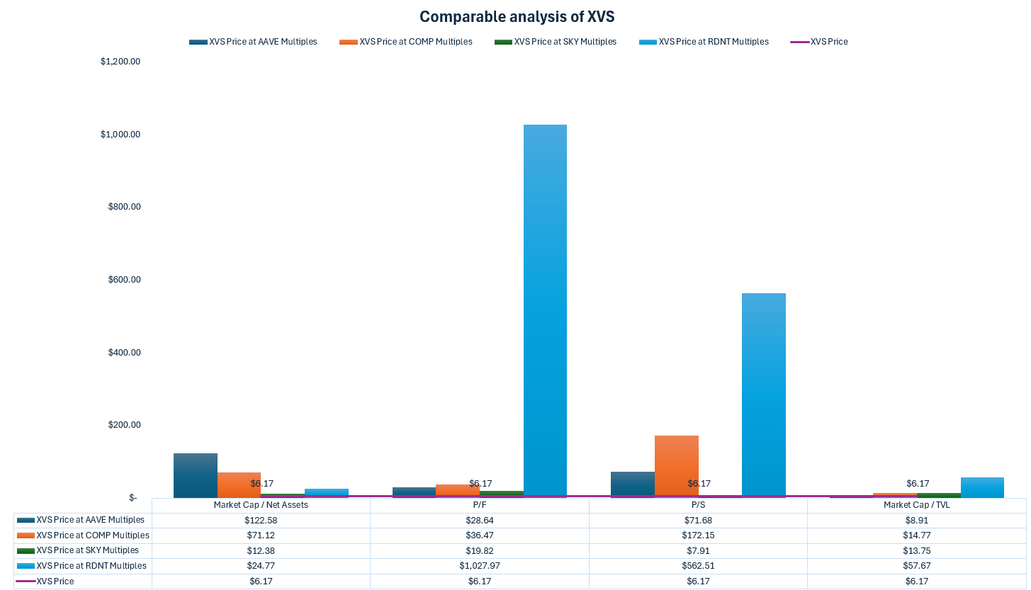 We conclude that XVS is undervalued at current market price. Based on the ratios of Aave and Sky, a more reasonable price might be in the region of $8.91-19.82, which could see an upside swing of 221%.