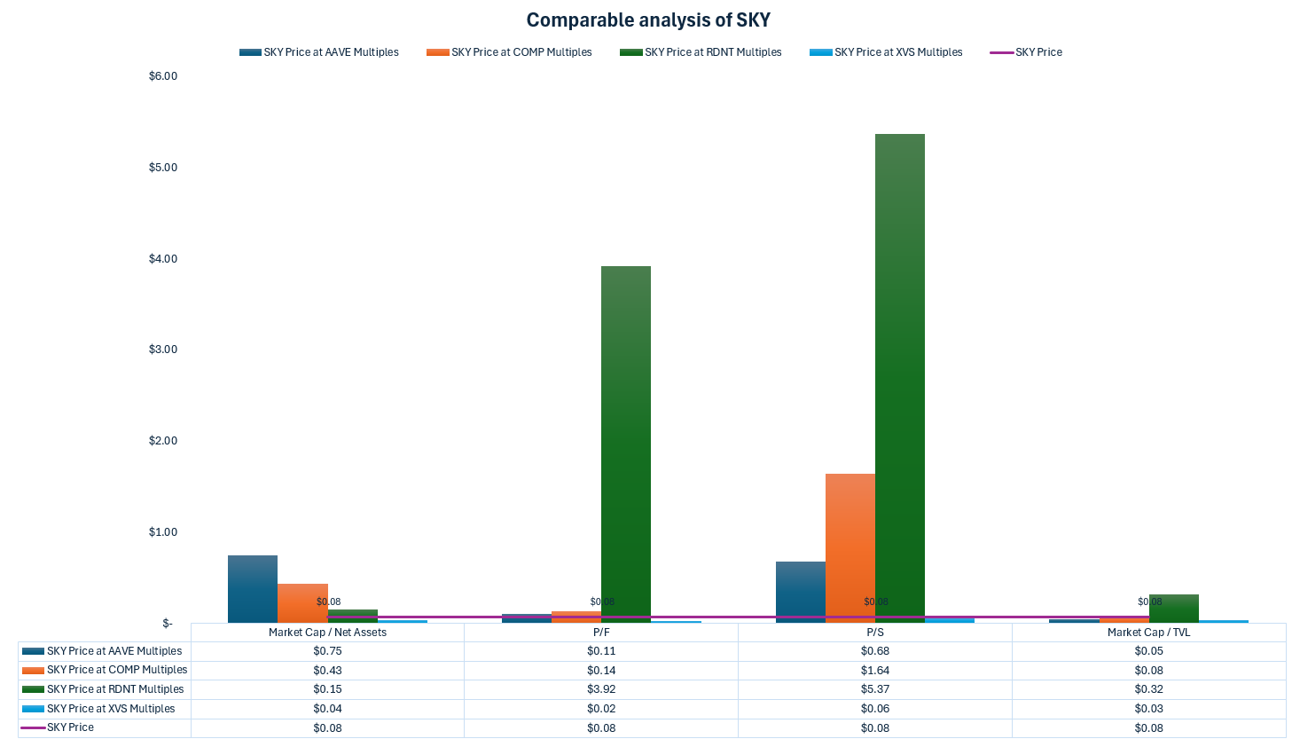 Aave and Venus look most appropriate and deem Sky to be in the right ballpark. Market cap/TVL ratios both place SKY below $0.08, whilst P/F has SKY between $0.02-$0.11. This is a possible upside of 37.5% and downside of 75%. Our analysis of the cohort as a whole leads us to conclude that SKY is probably slightly overvalued and has a realistic downside of 37.5% to $0.05.