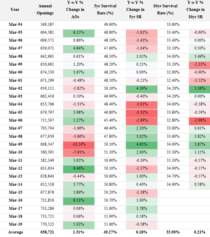 However, data on business survival rates in the U.S. reveal a worrying trend. Since 1994, on average, 49.27% of new firms in the U.S. remain operational after five years, dropping to 33.90% after 10 years (Table 1) [52]. This is not unexpected if we consider that investment bank lending has decreased, and VCs focus on early-stage SMEs. Firms outside of this cohort receive less funding, supporting literature that correlates a lack of capital with discontinuance [19-27]. Nonetheless, though the number of annual openings has increased 35.33% across this period, the expected five-year survival rate has increased just four percent. Moreover, an annual increase or decrease in the number of new firms is met with an opposing effect on survivability in 16 of 25 annual sessions (64%). In other words, for a given year, when the number of new firms increases, the survivability rate will likely decrease, and vice versa. This suggests that, despite a proliferation of private financiers and increasing entrepreneurial activity, current solutions fail to improve the survivability of new businesses.